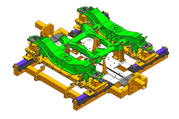 該工裝用于350公里動車組車體底架的翻轉,將底架鋼結構翻轉一定角度,使得焊縫處于平焊位置,而且配合設計可以電動升降的小車,從而方便焊接操作,保證焊接質量。